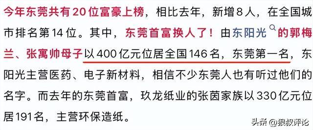其中,东莞首富换人了!由东阳光的郭梅兰、张寓帅母子以400亿元位居全国146名,东莞第一名。