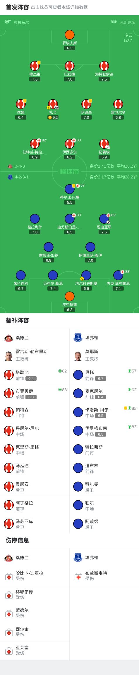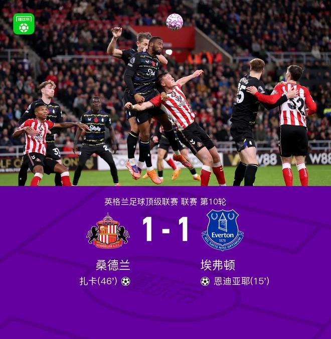 - 2025年11月04日 英超-桑德兰1-1埃弗顿排第4 恩迪亚耶破门扎卡扳平基恩手球引争议